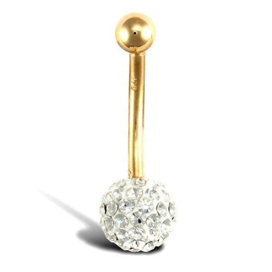 Alright, brace yourselves for a golden disco ball extravaganza, my party people! Feast your eyes on the 9ct Gold Crystal disco ball belly bar – it's not just bling, it's a whole vibe. We've got a 1.6 gauge barbell, 12mm long, and at the end is the star of the show, we've got a stunning 8mm Quartz Crystal set sphere. And hold onto your dance shoes, because every bit of metal in this piece is 9ct Yellow Gold – none of that plated or filled nonsense, just pure, unadulterated Gold glitz.